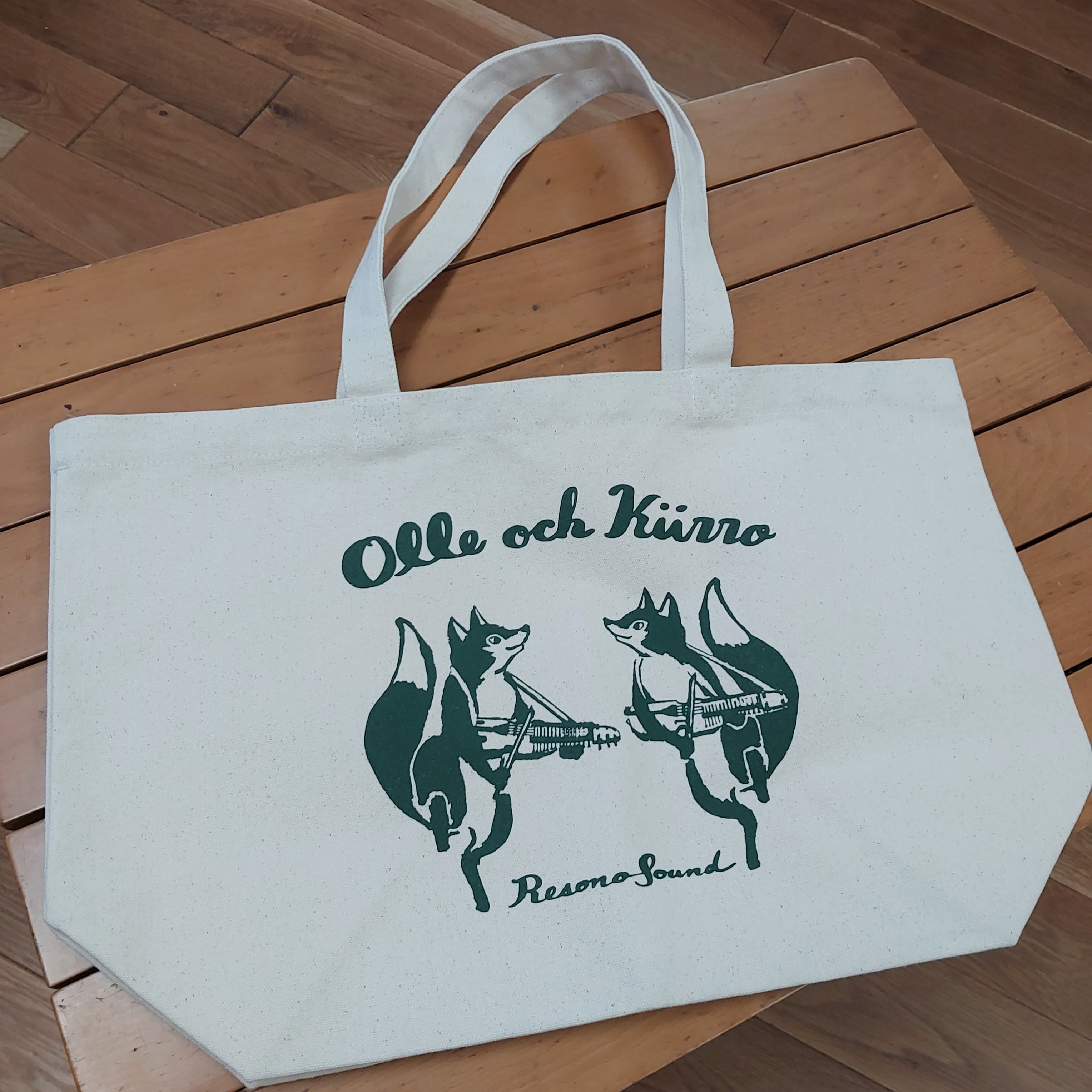 レソノサウンドの屋根裏に住みニッケルハルパを弾くキツネ、オッレとシーロのトートバッグができました!